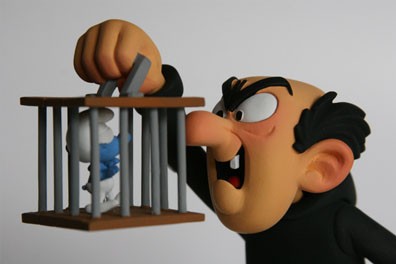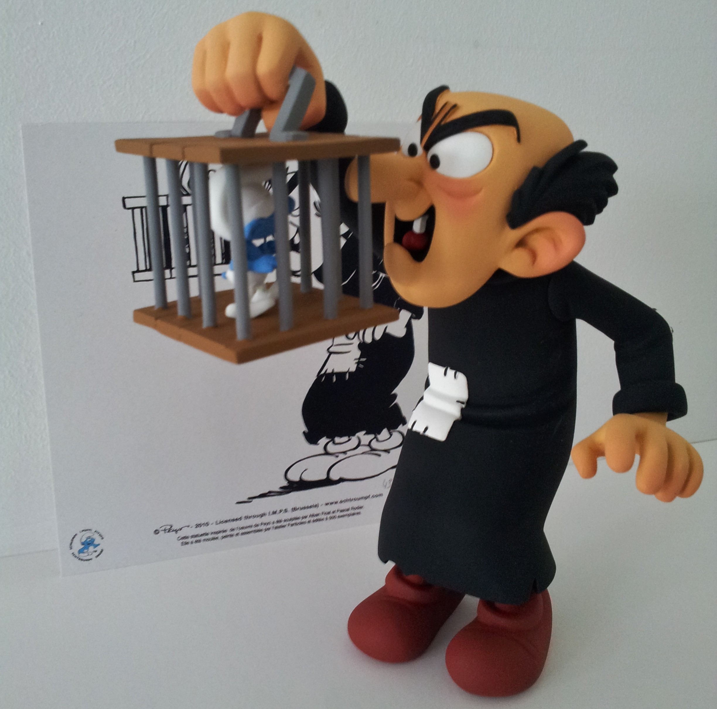 Malheur ! L’immonde Gargamel est parvenu à ses fins ! Un petit Schtroumpf est tombé entre ses griffes et nul ne sait ce qu’il va en faire ! N’entendez-vous pas son atroce ricanement ? Bien sur, ceux qui parmi vous ont eu l’occasion de rencontrer des Schtroumpfs ont tout de suite voulu les attraper… C’est bien compréhensible. Mais ils savent aussi qu’en captivité ils perdent beaucoup de leur charme: il est bien plus intéressant de les regarder de loin faire leurs petites affaires dans leur village et alentours. Seulement voilà, Gargamel ne voit pas les choses de cette façon : il lui FAUT un Schtroumpf, c’est viscéral ! Le regard plein de haine et de rapacité, le rictus goguenard et grimaçant de l’infâme sorcier nous font envisager le pire… Mais qui sait si les compères de l’infortuné petit bonhomme bleu ne sont pas déjà en train de livrer bataille pour le délivrer ? Avec Alban au patamodelage et Pascal aux finitions et prototypage: c’est la première statuette à quatre mains chez Fariboles.