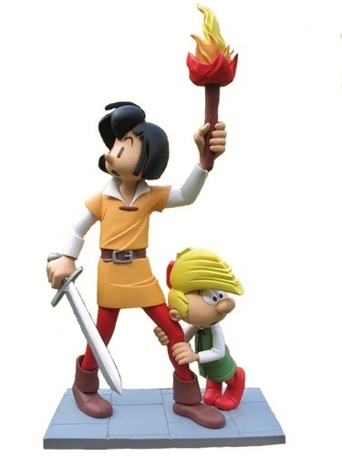 Statuette de Johan et Pirlouit reprenant la couverture de l’album « La Guerre des 7 Fontaines » d’après Peyo sculptée par Saint Emett.