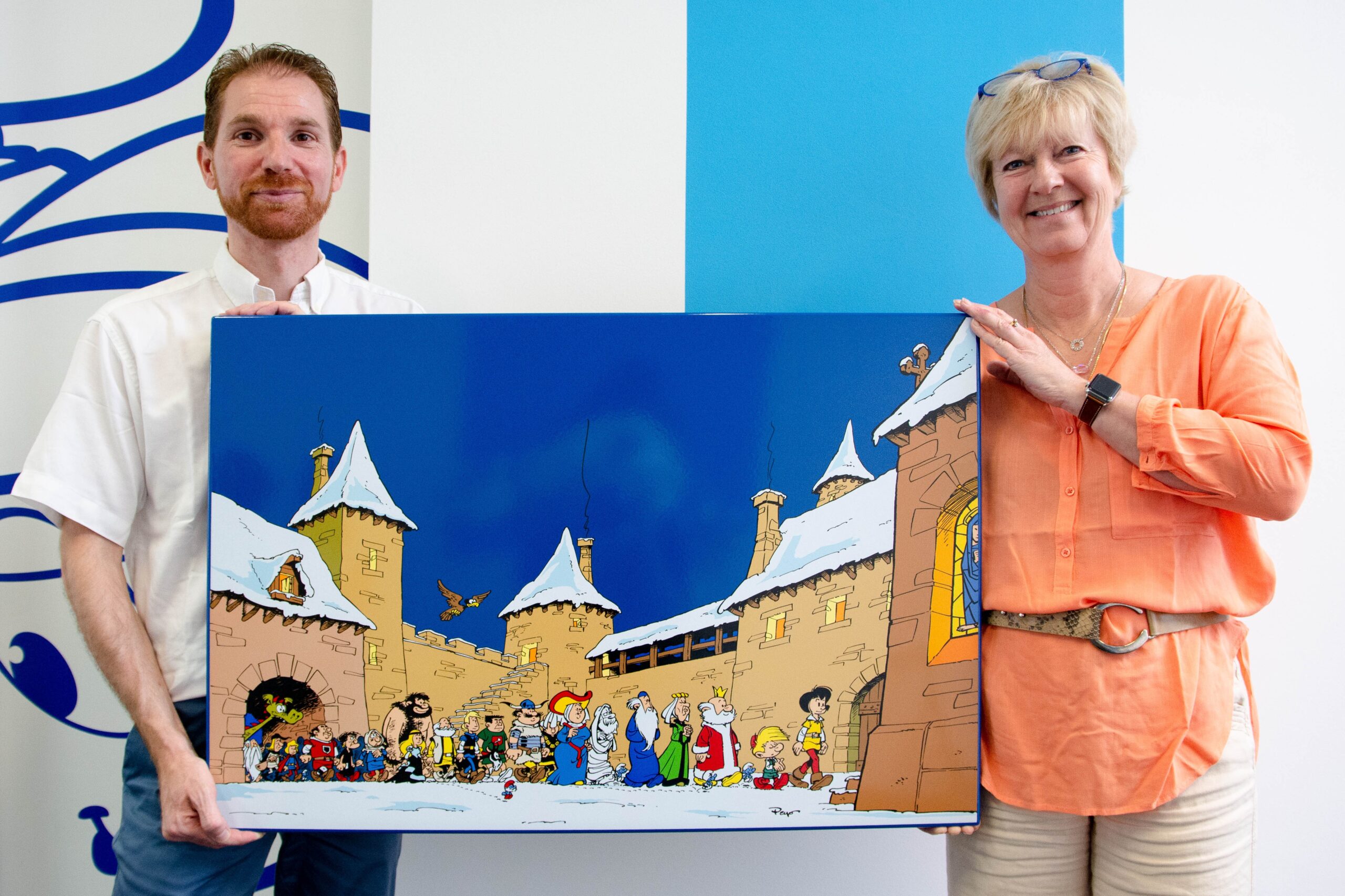 C’est la seule illustration de toute la série représentant tous ses protagonistes. Peyo a par ailleurs très rarement eu le privilège de faire la couverture du journal Spirou, encore moins pour cette série. Il s’agit ici des 2 plats de la couverture du journal, chose d’autant plus exceptionnelle, unique pour Peyo.