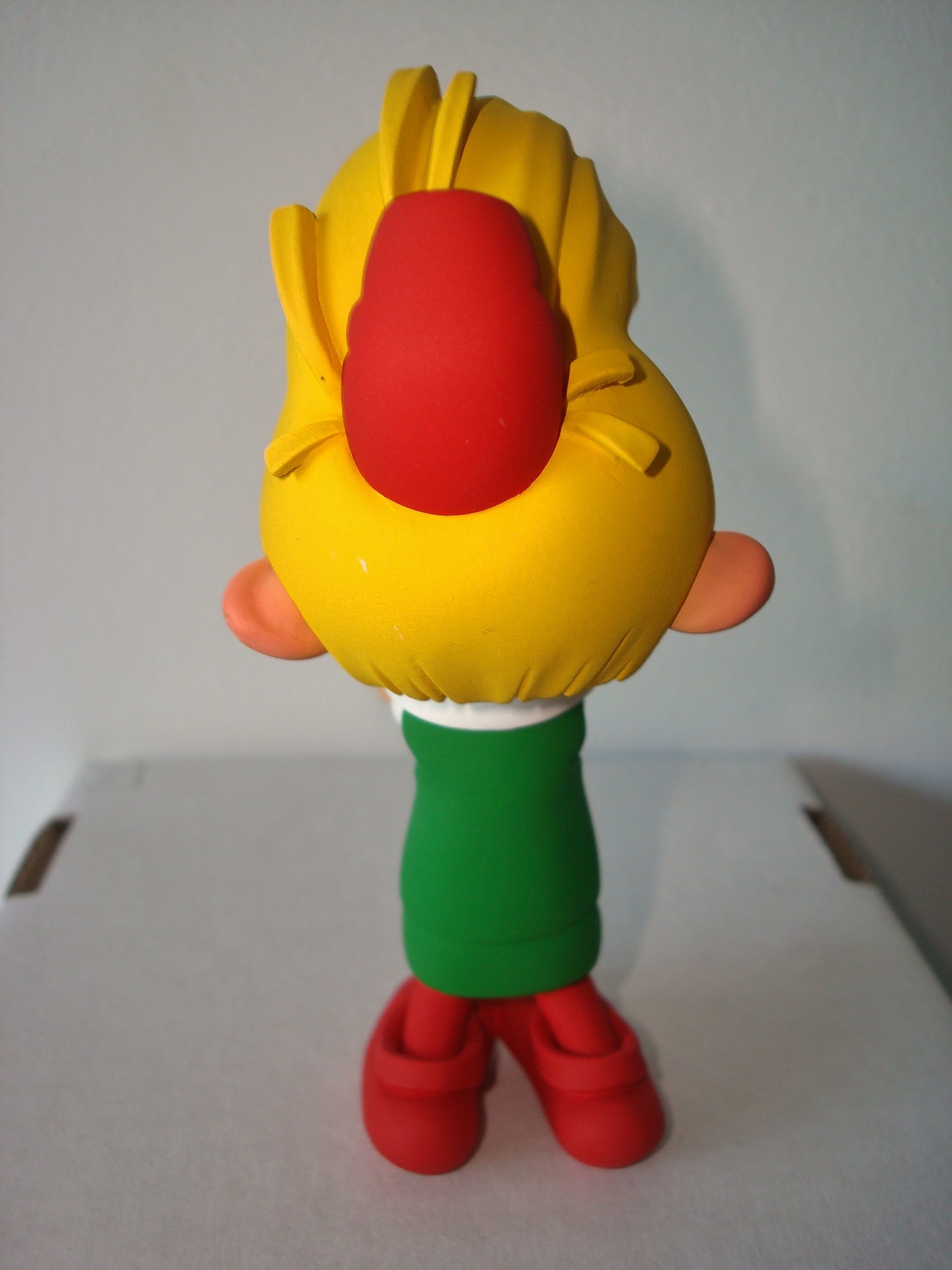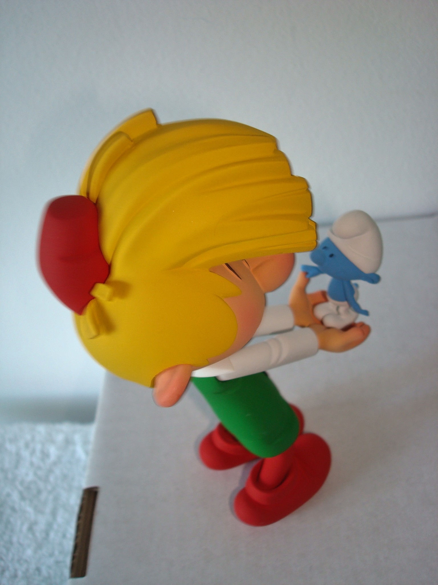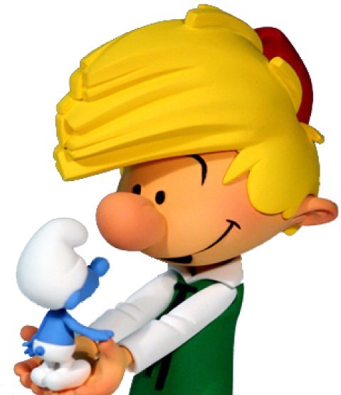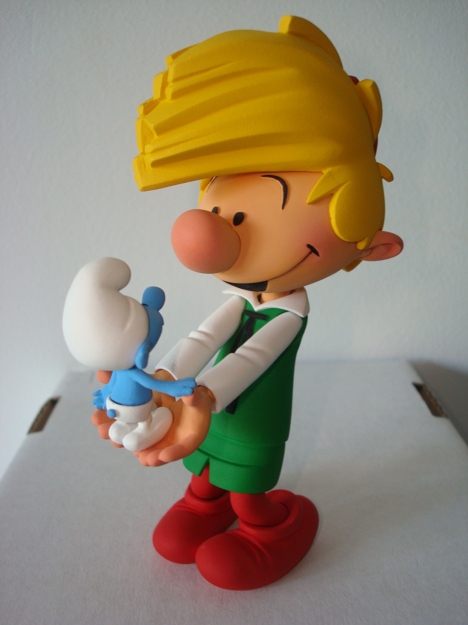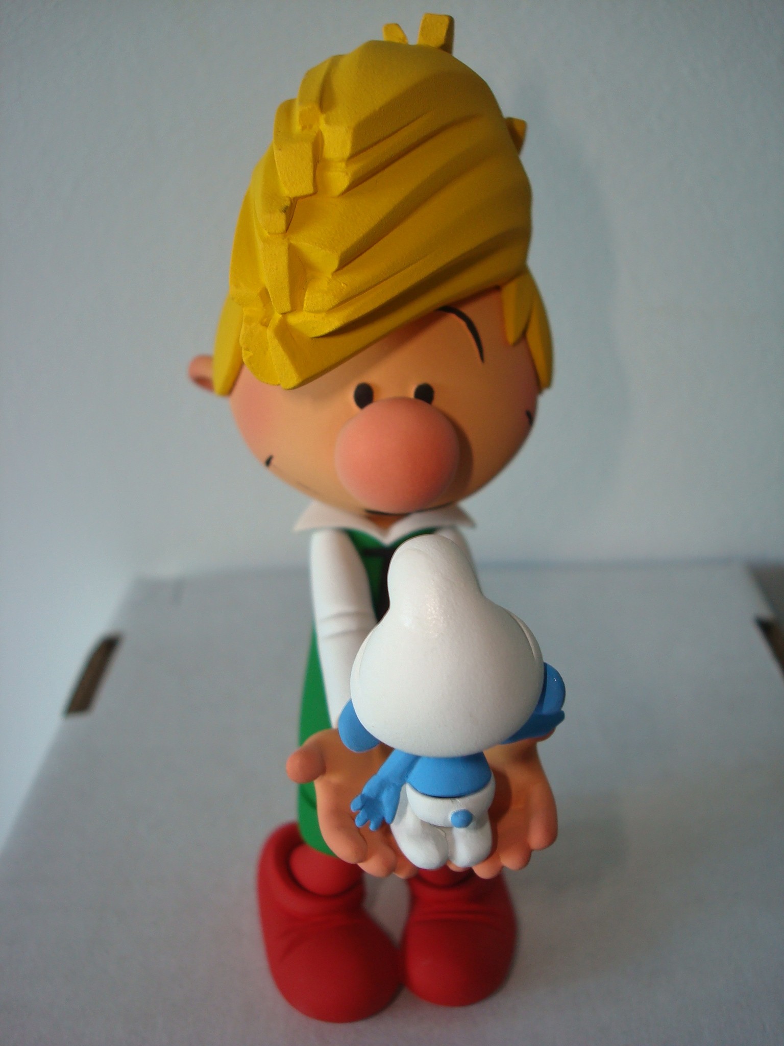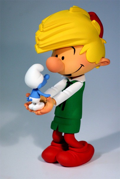 Alban Ficat nous a de nouveau étonnés avec cette scène fondatrice où Pirlouit est venu (accompagné de Johan) schtroumpfer ses petits amis! La ligne claire semble ne pas avoir de secrets pour lui et j’ai eu énormément de plaisir à le conseiller dans l’élaboration de cette statuette. En effet, nous n’étions pas trop de deux pour trancher des questions aussi cruciales que : Est-ce que la mèche de pirlouit penche des deux côtés en même temps ? ou encore: Quelle est réellement la taille d’un schtroumpf, sachant que la tête de Pirlouit fait la moitié de son corps ? Et avez-vous remarqué le geste attendrissant du schtroumpf qui s’appuie au pouce de Pirlouit pour ne pas tomber ? C’est là tout l’intéret de l’interprétation du sculpteur: trouver le petit détail que le dessinateur n’a pas précisé et en profiter pour y mettre son grain de sel !