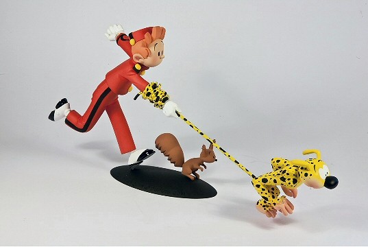 Depuis le temps que j’en rêvais ! J’ai enfin eu la possibilité de réunir le Marsupilami et Spirou (avec Spip en prime !) dans une même scène ! Les visuels sympa ne manquent pas, mais celui-ci m’a tout de suite paru incontournable. Il y a tout les ingrédients : dynamisme, mouvement, tension (surtout sur la queue !), couleurs vives, nécessité de trouver l’équilibre pour que nos trois compères semblent presque ne pas toucher le sol et… c’est une scène vue de dos dans l’album ! J’ai déjà évoqué dans mon livre le plaisir que j’ai d’aller dénicher une case oubliée, une scène improbable ou un détail resté jusqu’alors inaperçu. Je m’imagine que Franquin l’a mise là juste pour voir si un jour quelqu’un la sortirait du lot ! Bon, c’est ce que je me raconte. Mais même si ce n’est pas vrai, au moins il reste une scène de cavalcade effrénée dans laquelle à l’évidence Spirou n’en mène pas large !